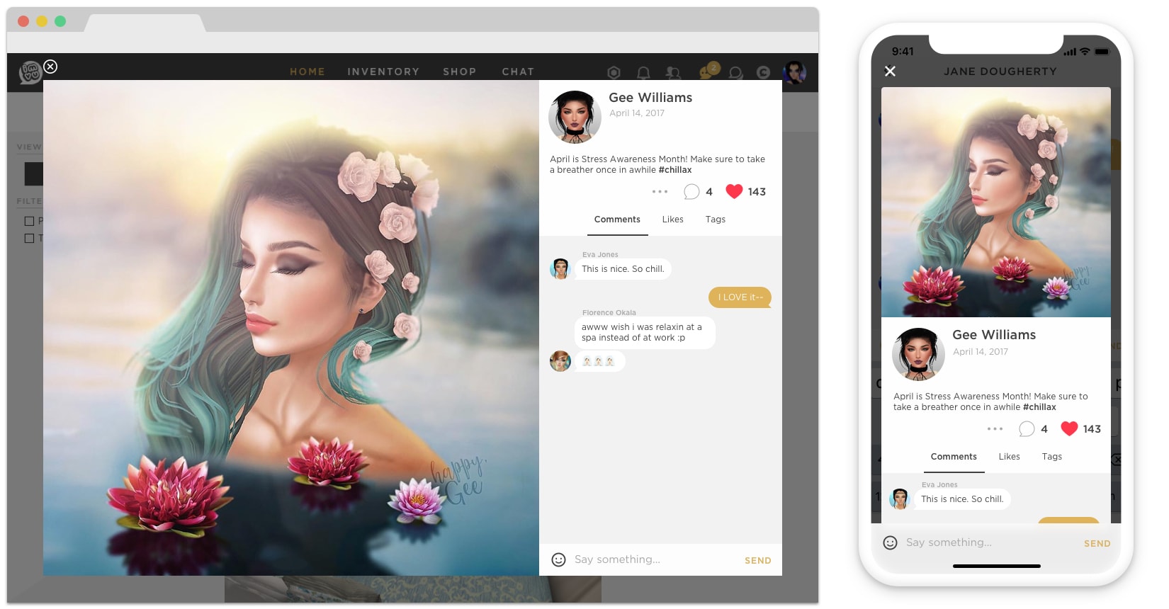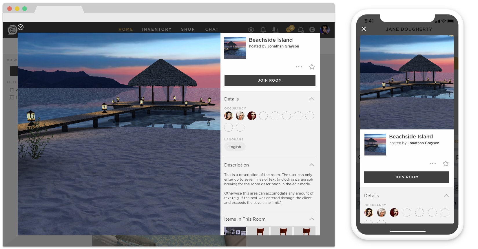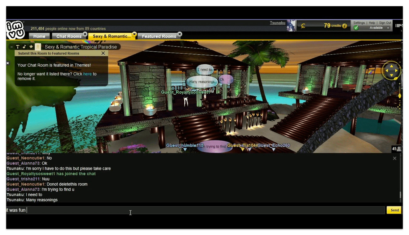 IMVU offers an immersive social experience by means of a 3D scene (immersion) and a chat interface (social). Both features are naturally dense with interaction, and given mobile's small real estate, often vie for focus.