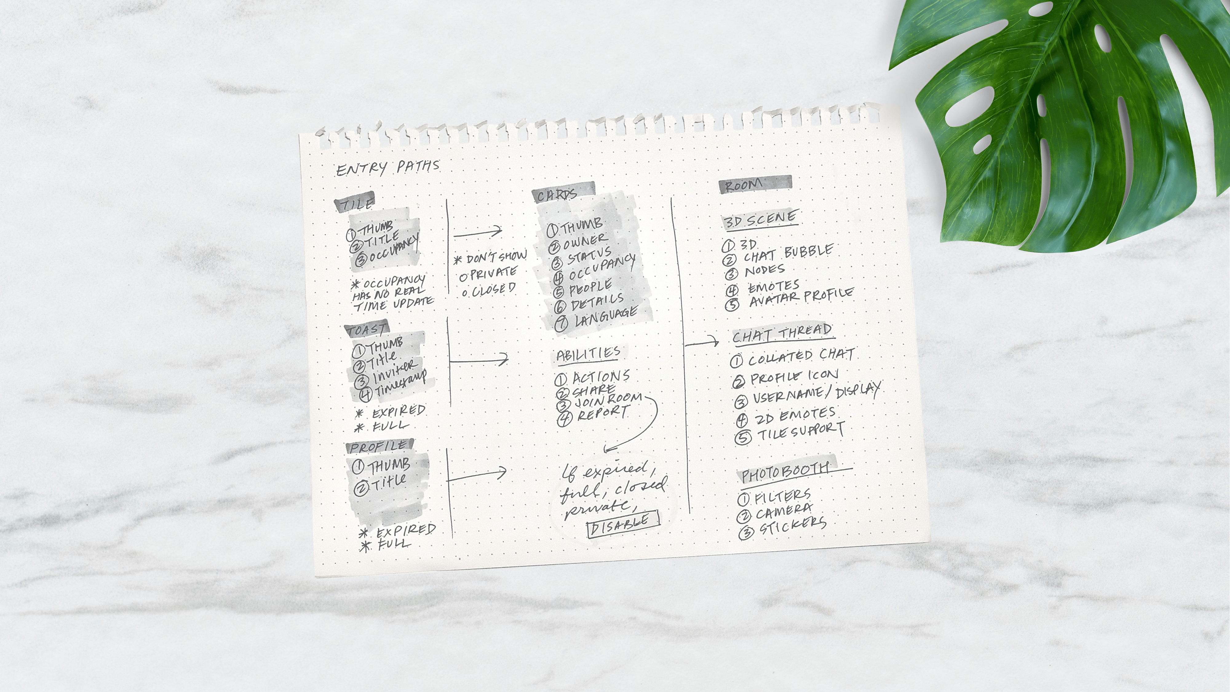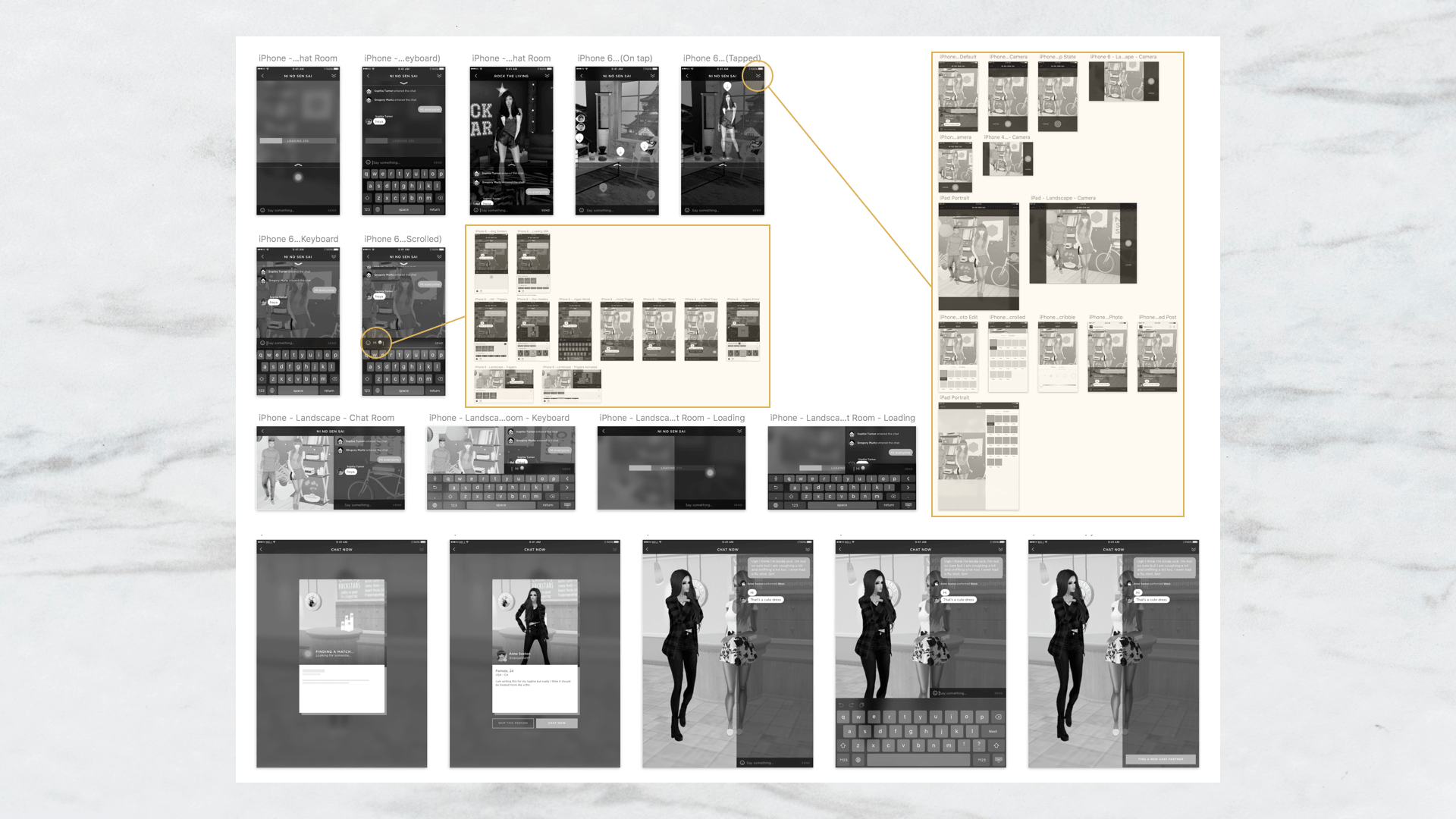 Wireframes for loading, 3D navigation, emotes, and photo-taking flows (for phone and tablet)
