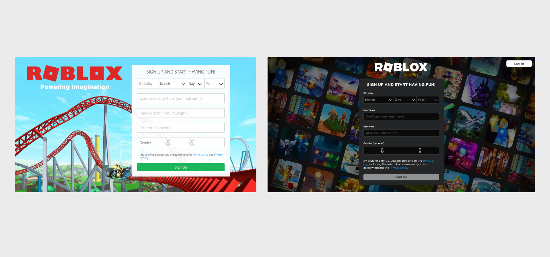 I decided to clean the slate, adopting a dark, minimalist color palette to allow our product showcase its content with a cinematic quality. Our branding content also required reevaluation, as the marketing material had relied heavily on Roblox avatars for promotional needs. While these avatars were iconic to the platform, they represented only a fraction of Roblox’s offerings. This also inadvertently limited the perception of Roblox's vast potential, positioning Roblox more as an avatar product than a platform for immersive experiences. Realizing that neither a single image nor a character could capture Roblox’s vast capabilities, I arranged a variety of scenes from Roblox experiences into a tilted grid - an angle inspired by our shortform logo. This approach ultimately became the ubiquitous backdrop for all of Roblox’s branding.